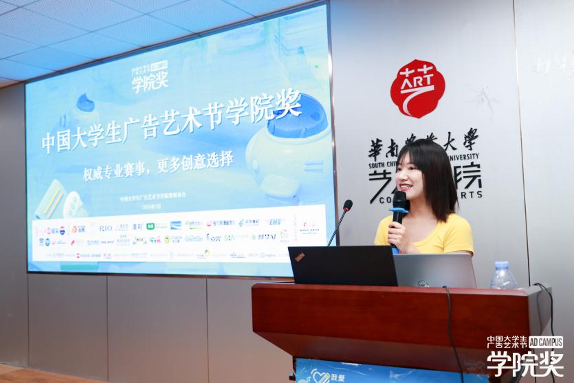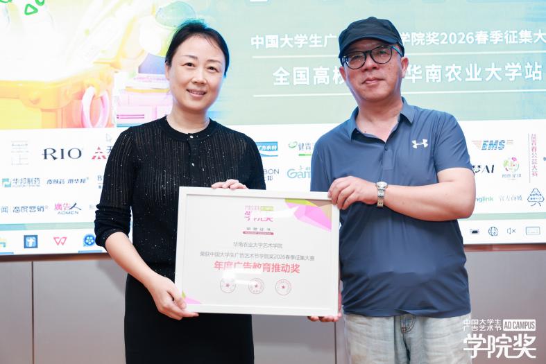 仪式现场,张汛先生登台为华南农业大学颁发“中国大学生广告艺术节学院奖2026春季征集大赛・年度广告教育推动奖”,艺术学院系主任赵娜老师代表学院上台领奖。此次颁奖,不仅是对校方教育成果的肯定,更开启了校企深度合作的新篇章。