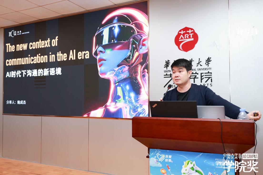 为助力学生们在创意思维和实践能力层面的提升,在大咖讲创意环节,特别邀请了来自BU蓝昊合伙人&首席创意官鲍成杰先生。他在演讲中深入剖析了AI时代下广告行业的变革趋势,他深度解析 AI 技术驱动下广告行业的变革趋势,剖析媒体迭代对广告创意、传播策略、效果评估的深刻影响,鼓励青年学子紧跟时代、勇于探索,持续提升专业素养与综合实践能力。