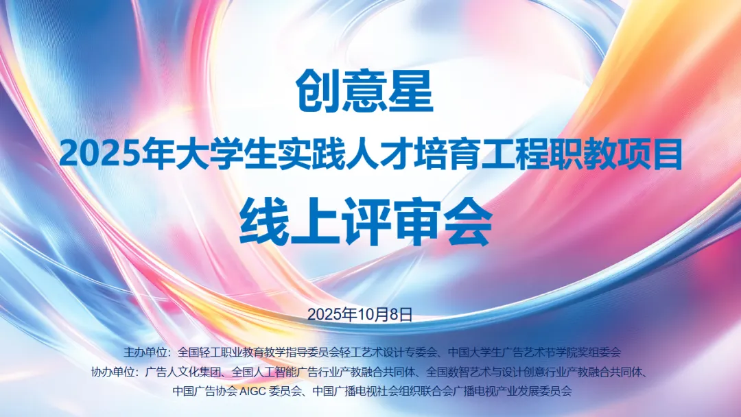 2025年10月8日-10日, “创意星” 大学生实践人才培育工程职教项目线上评审会圆满完成。本次评审汇聚职业教育与艺术设计领域权威专家组成评委团,将严格依据评审细则,从视频类、包装与产品设计类、综合设计类、策划类四大类别作品中,选拔优秀创意的职业院校学生作品。