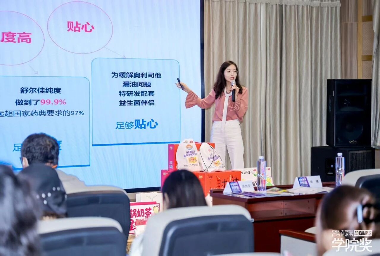 鲁南制药品牌经理凌爽女士现场解析赛事策略单,结合往届优秀作品案例,引导大家挖掘创意的多元表达形式。同时聚焦大学生群体常见的体重管理、健康饮食等实际问题,结合舒尔佳成分特点与适用场景,通过贴近生活的案例,深入浅出地解析“健康减脂,科学减重”的体重管理逻辑,并为大家提供了切实可行的健康建议。
