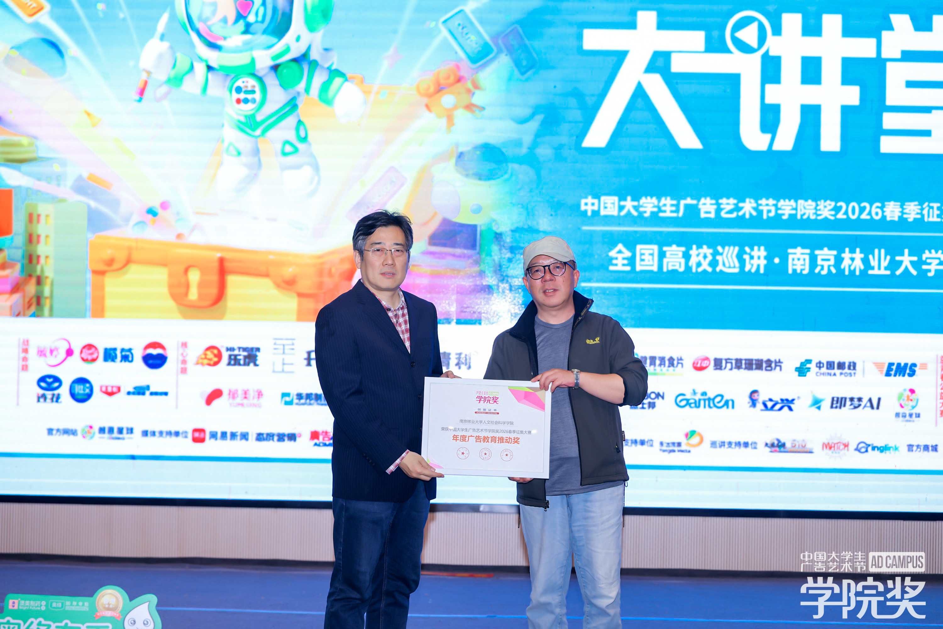 致辞后迎来庄严的授牌仪式。广告人文化集团副总裁张汛先生登台,为南京林业大学人文社会科学学院颁发“中国大学生广告艺术节学院奖2026春季征集大赛・年度广告教育推动奖”,学院党委书记卫欣书记代表学院上台领奖。