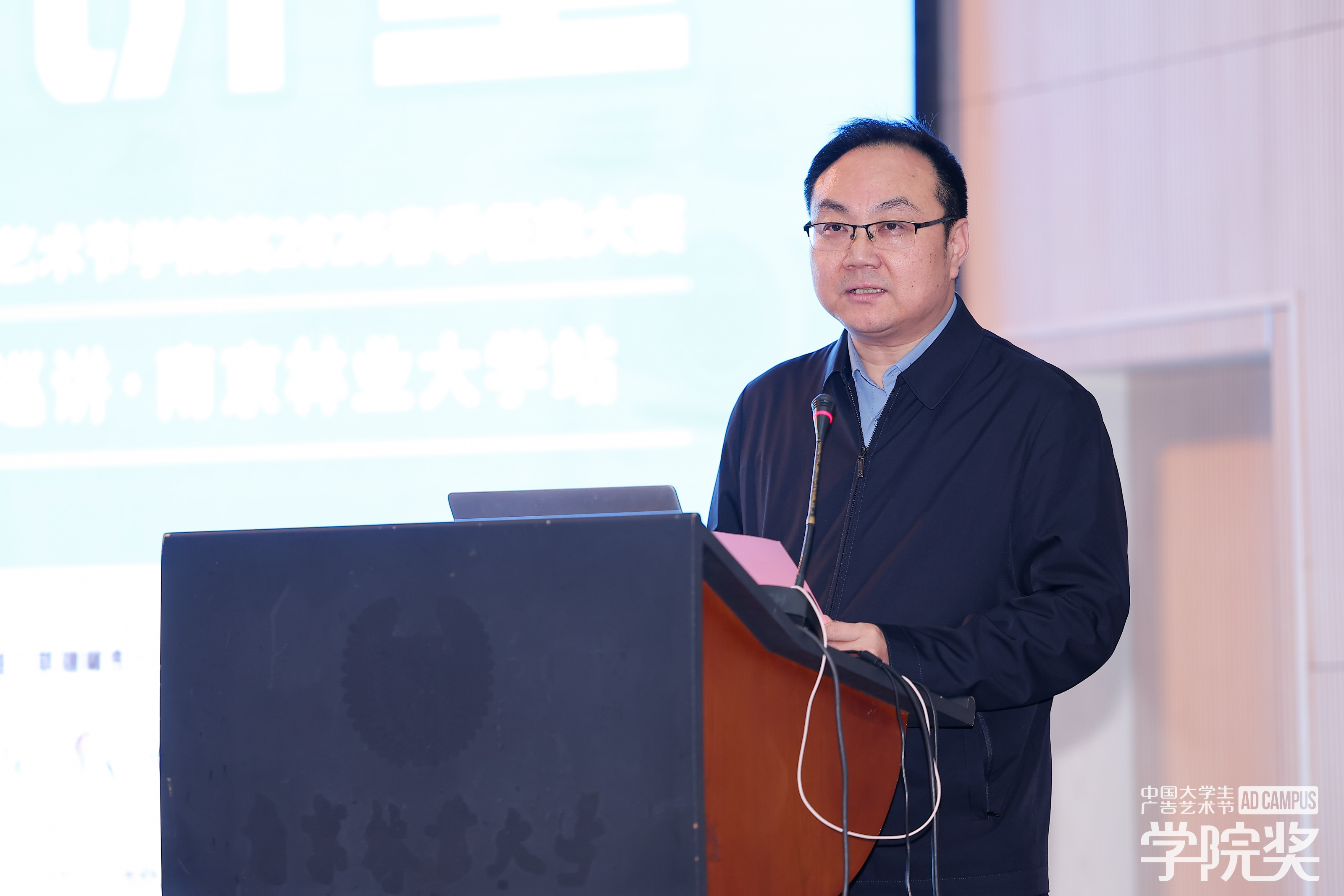 活动伊始,南京林业大学人文社会科学学院陈相雨院长登台致辞。他回顾学院在产教融合、实践育人方面的探索与成果,指出在媒介变革与行业升级的当下,高校教育必须紧贴市场、强化实战。他表示,学院奖作为国内规模大、影响力广的大学生广告赛事,为课堂教学与产业需求架起重要桥梁,本次巡讲将进一步推动广告教育创新转型,激发青年学子创意潜能,为学子职业发展筑牢根基。
