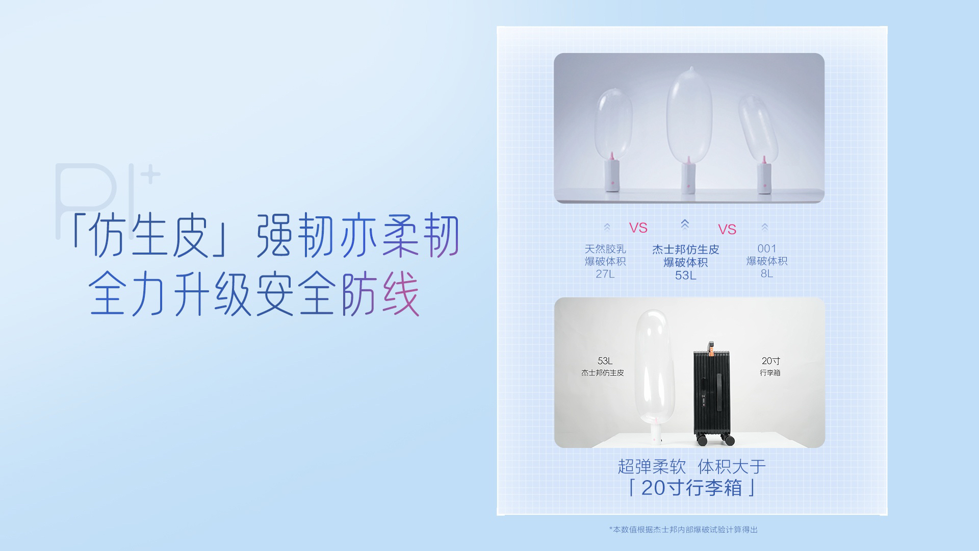 爆破体积可达53L,是传统天然胶乳套的2倍。什么概念?体积大于20寸行李箱,超弹柔软,可靠防护。