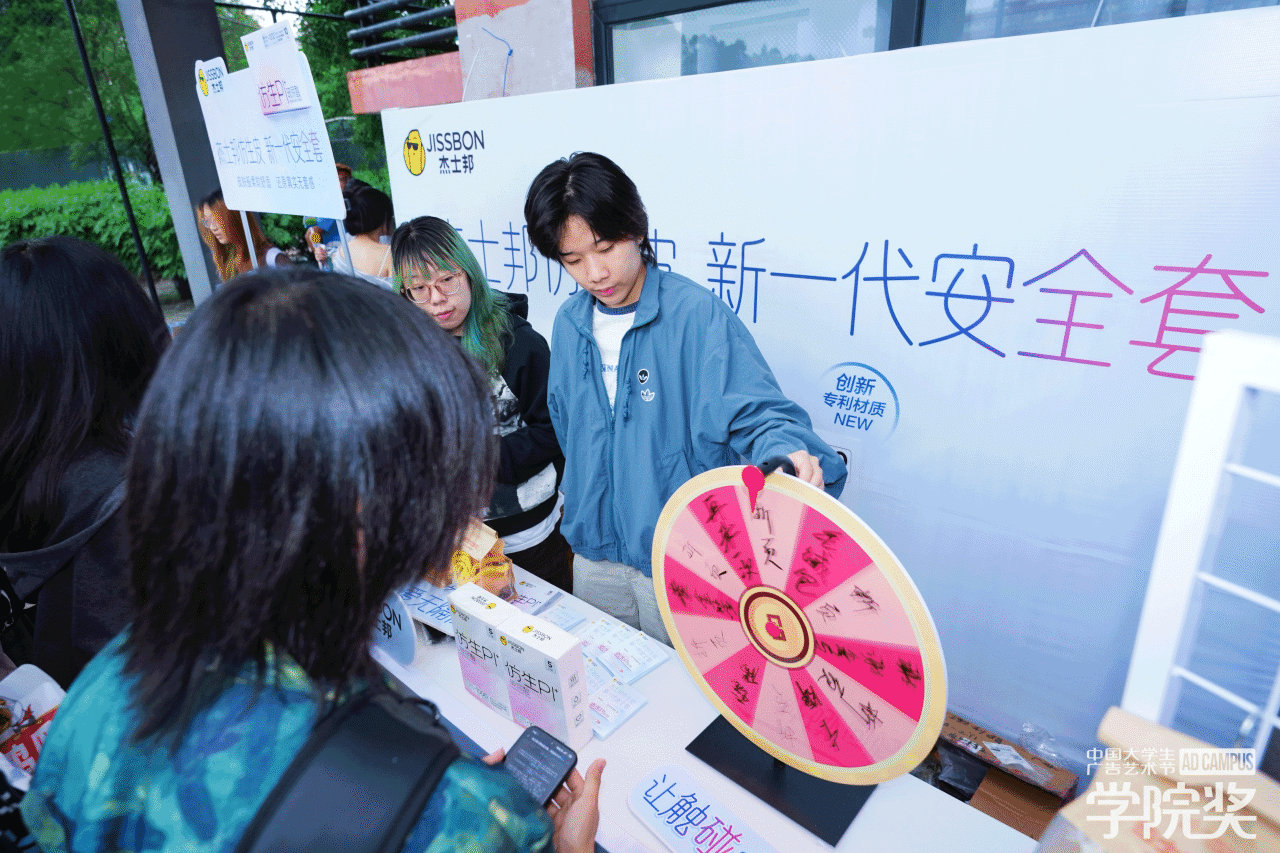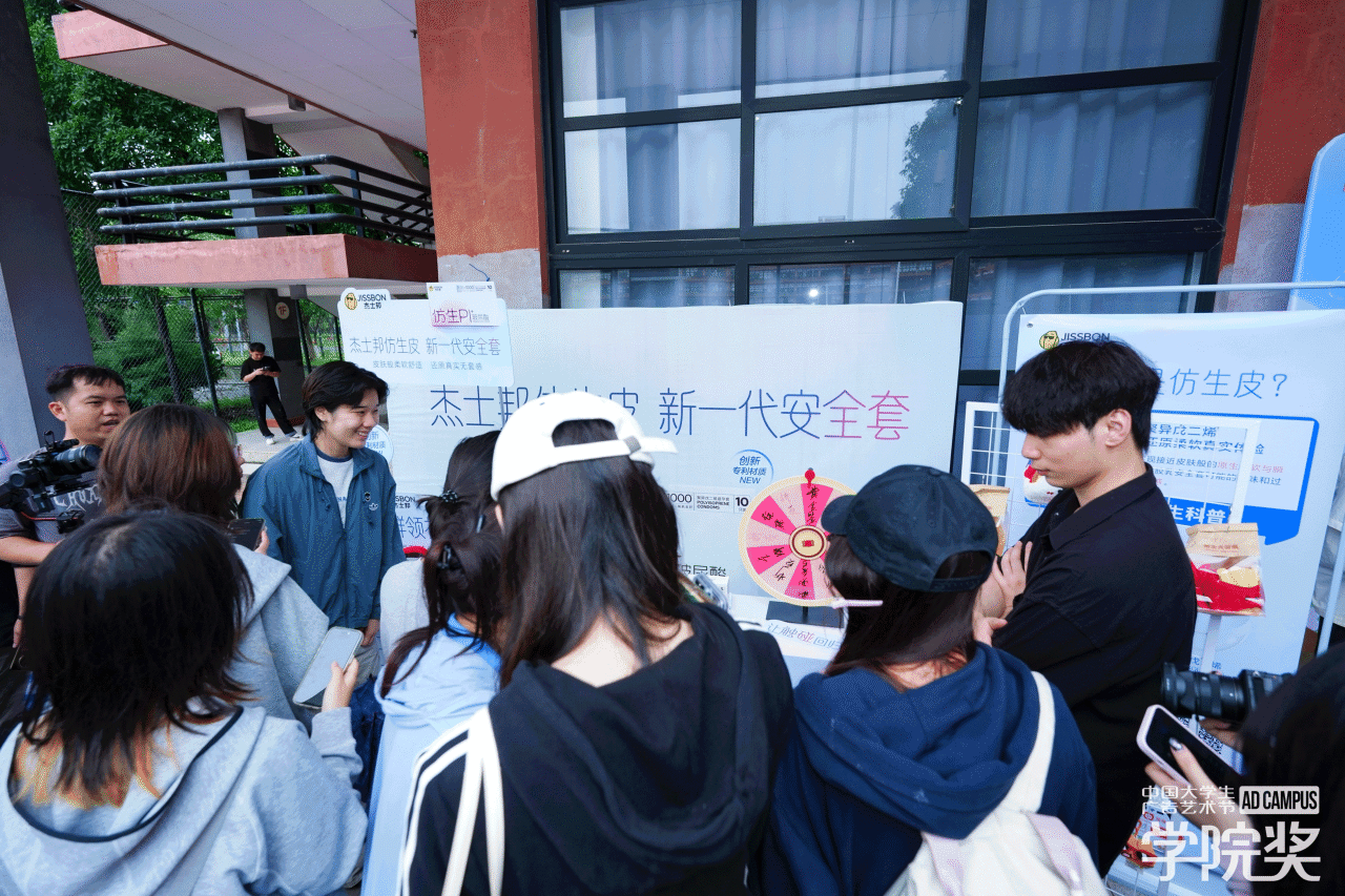 课堂内灵感碰撞不停,课堂外早已人气拉满。杰士邦以简约高级的视觉展位设计,将品牌体验区自然融入广美浓厚的艺术氛围之中,干净利落的线条与高级质感的呈现,精准契合美院学子的审美偏好,刚一亮相便成为校园里极具辨识度的打卡点。