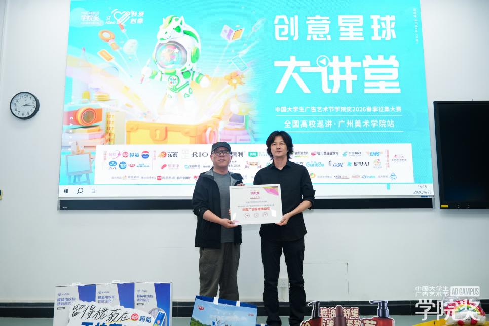 仪式现场,广告人文化集团副总裁张汛先生登台,为广州美术学院颁发“大学生广告艺术节学院奖2026春季征集大赛・年度广告教育推动奖”,广州美术学院视觉设计艺术学院副院长廖向荣先生代表学校上台领奖,以表彰学院在产教融合领域的前瞻性探索与实践,此次获奖更是对视觉设计艺术学院实践育人理念的又一次认可。