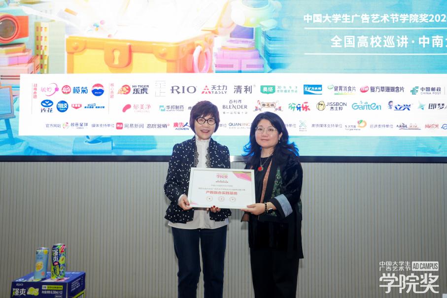 广告人文化集团副总裁、大学生广告艺术节学院奖秘书长袁健女士登台,为中南大学颁发“大学生广告艺术节学院奖2026春季征集大赛・产教融合实践基地”证书,中南大学建筑与艺术学院副教授、硕导,设计系系主任毛寒女士登台领奖,以表彰中南大学在广告艺术教育领域深耕的成果。