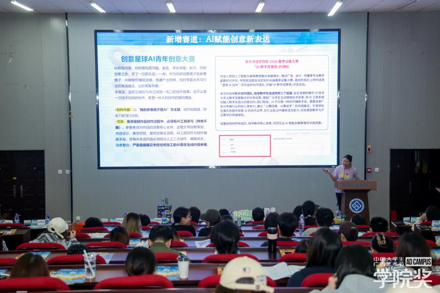为让学生们更加系统性地理解本赛季赛程、命题信息,找到创意新思路,学院奖组委会代表陈桂蕊女士登台带来赛事解读。从本届春季赛的赛制创新、参赛流程、作品规范到创作策略,全方位拆解备赛核心,为学子们送上精准实用的创意指南,助力大家理清创作思路、高效投身赛事。
