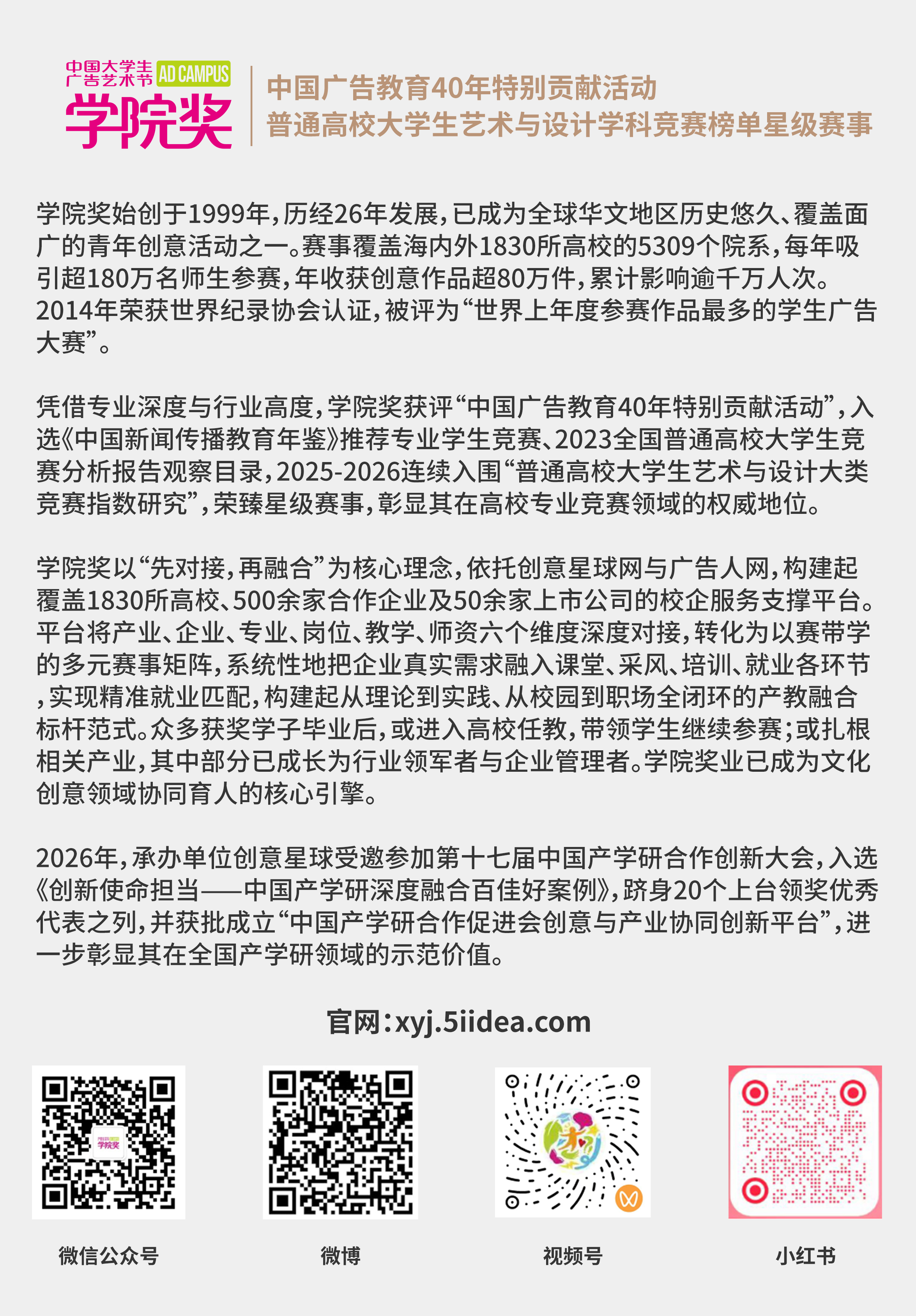 本次学院奖2026春季征集大赛创意大讲堂中南大学站已圆满落幕。未来,学院奖将继续深化校企协同、产教融合的创新模式,持续为高校创意教育注入新动能,为青年创意者铺就逐梦之路。我们期待见证中南学子携匠心创意精彩亮相,以青春力量点亮创意星河,在创意之旅中斩获佳绩!
