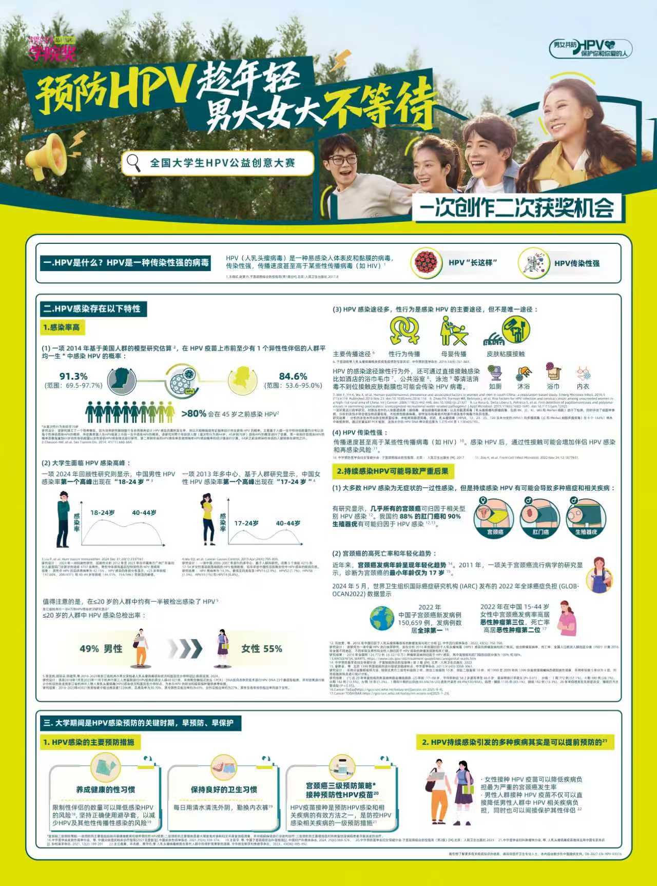 本活动征集HPV主题创意科普作品,旨在提升大学生对HPV感染的认知与预防行动意识:希望通过创意传播,能让大学生意识到HPV感染与自己息息相关,且会导致严重后果(如女性持续感染HPV可能导致宫颈癌;男性持续感染HPV可能导致多种癌症和相关疾病,且增加伴侣感染和患宫颈癌的风险),并能号召大学生立刻采取HPV预防行动。