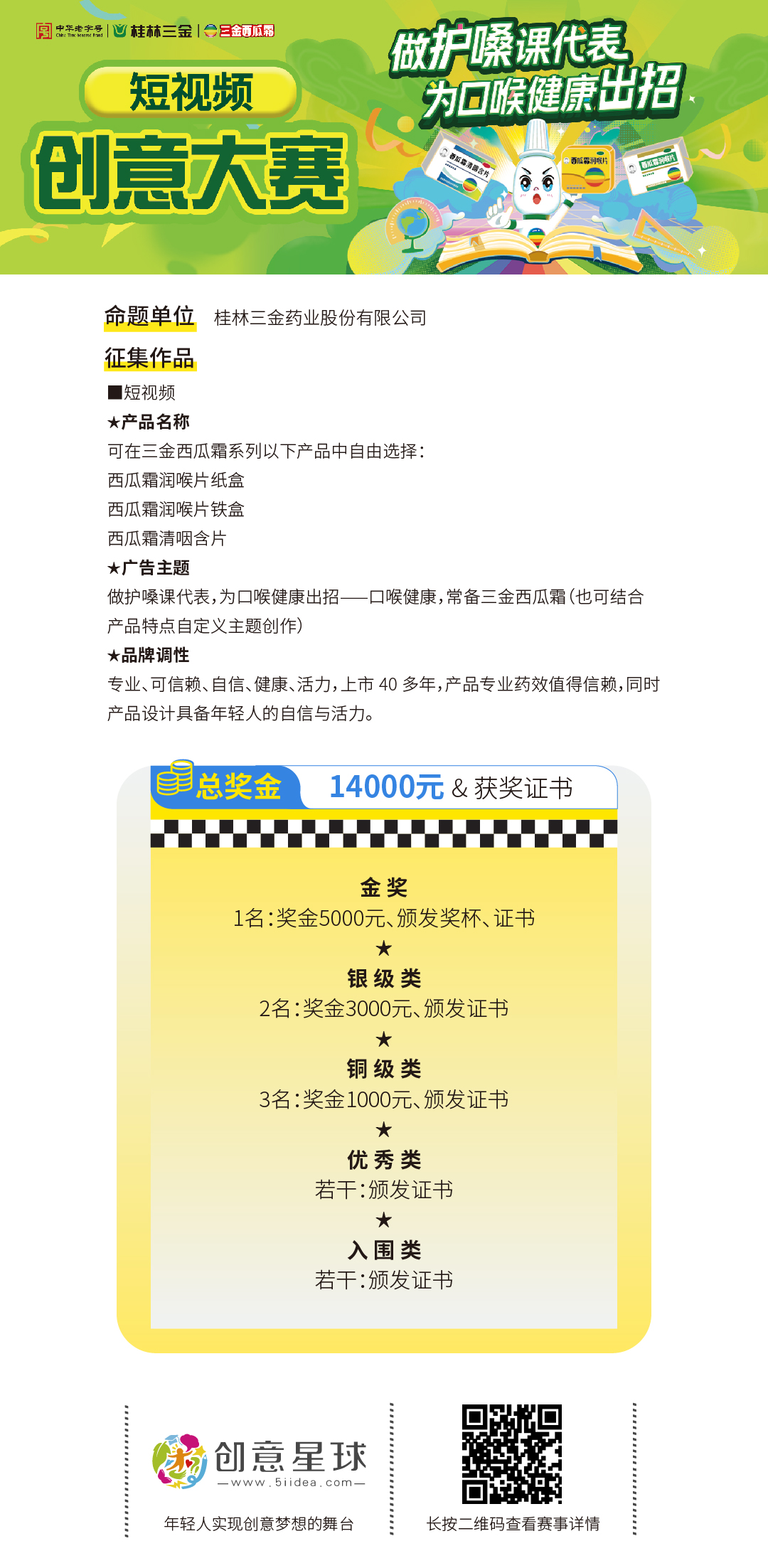 2.参赛作品需要露出三金西瓜霜品牌logo、产品包装、桂林三金企业logo(作为可选项)。