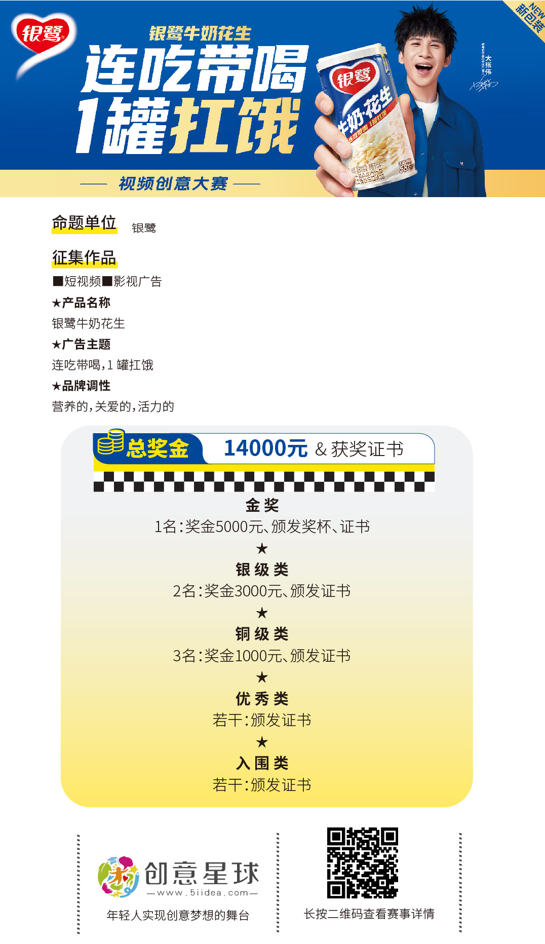 1.所有针对【银鹭牛奶花生】的参赛作品,须围绕“连吃带喝,1罐扛饿”的核心沟通进行创作。