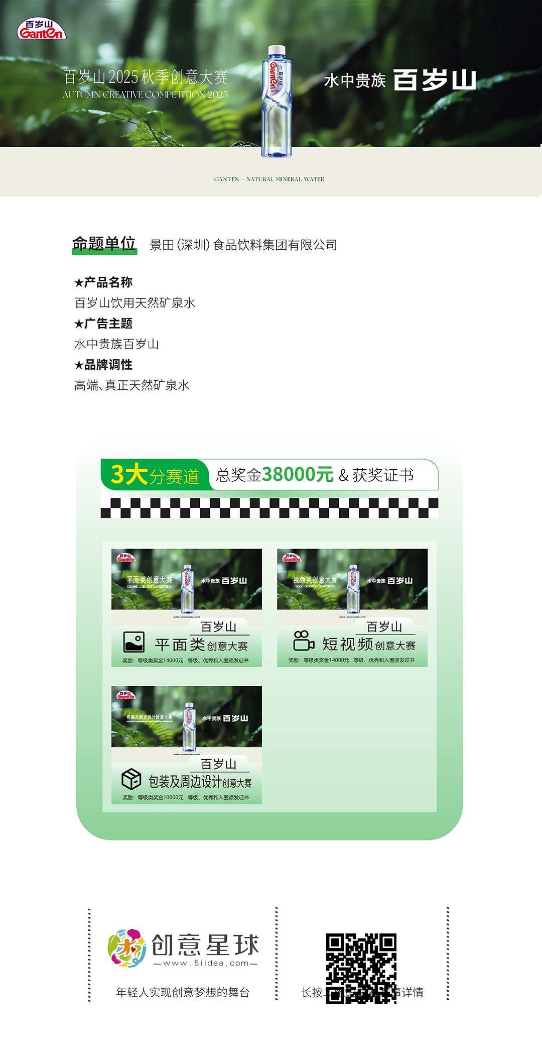所有百岁山参赛作品,务必与品牌、产品结合,将“水中贵族百岁山”的品牌理念、高端天然矿泉水品牌定位与体育、艺术、文学、科学等进行结合融合,体现出对善良、正直、诚信、友爱、努力、富有责任感的高尚品德的追求。