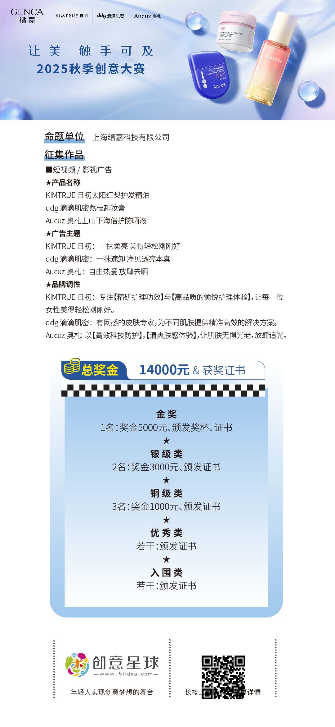 微电影、TVC、剧情演绎、试验测评、动画等形式不限,单支/系列均可,影视广告15秒~2分钟,短视频15秒~60秒,需适配抖音、小红书等年轻化平台竖屏传播,内容积极健康。