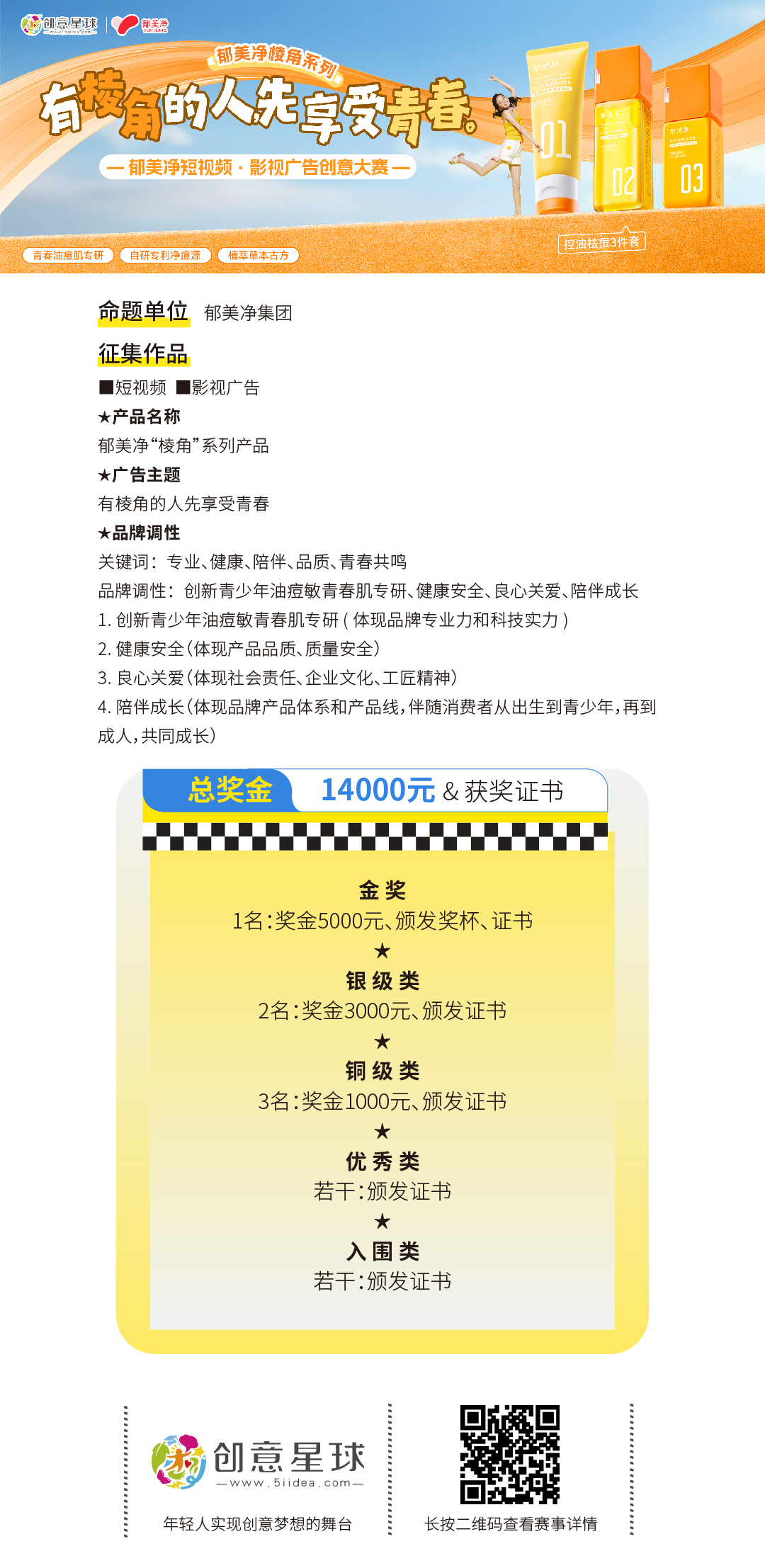 2. 作品创作需聚焦棱角系列核心主推的三款产品:郁美净净颜控油精萃水、郁美净控油平衡调理乳、郁美净控油净澈双管洁面乳,以创意体现产品与使用场景融合为佳,充分考虑青少年人群的内容喜好,具有传播力。