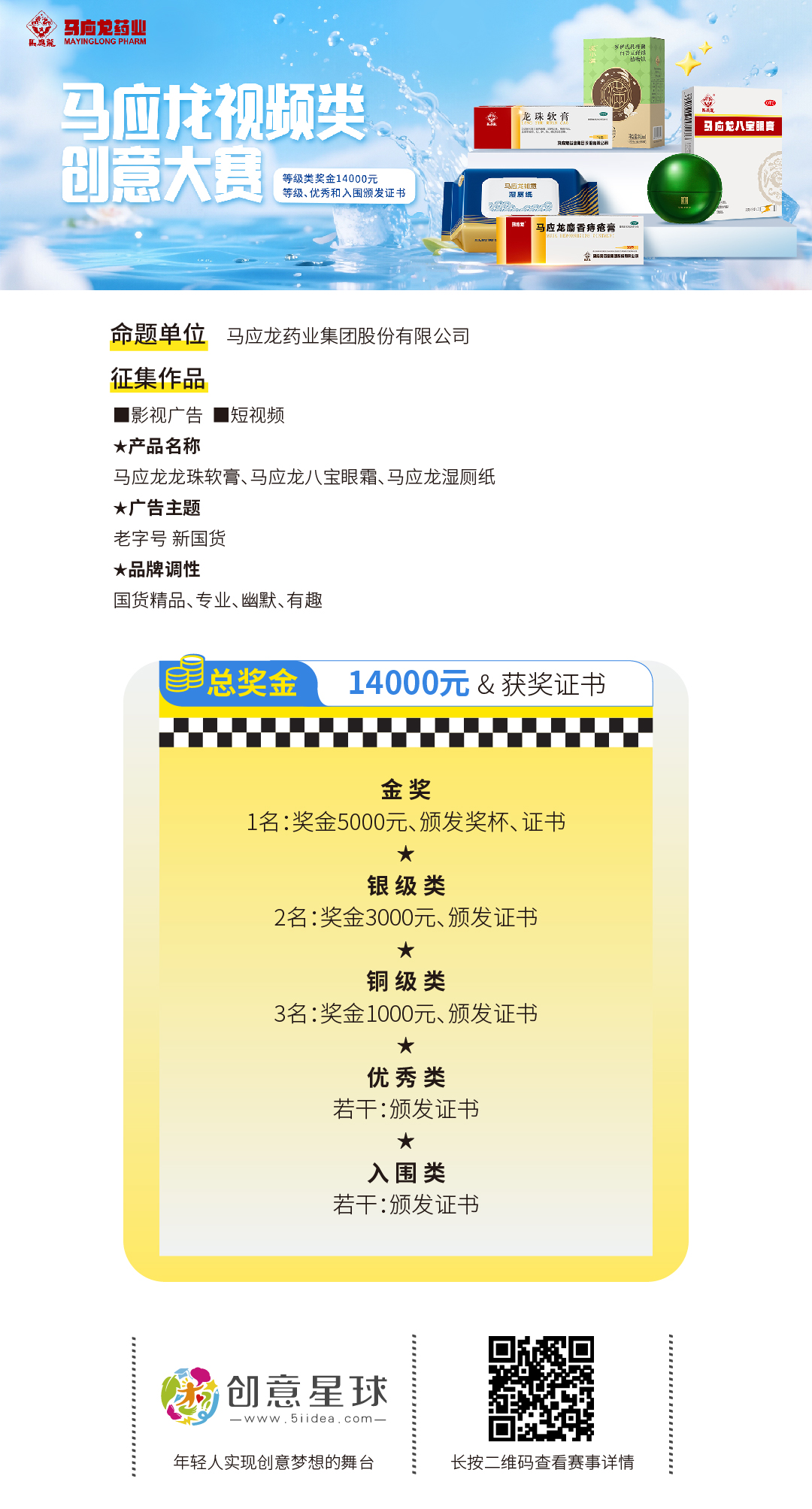 2.平面设计类作品需植入马应龙LOGO;短视频作品、策划类作品突出马应龙品牌调性、嵌入马应龙品牌元素,如产品,slogan等。