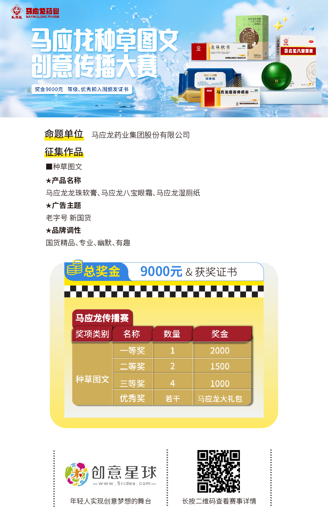 2.平面设计类作品需植入马应龙LOGO;短视频作品、策划类作品突出马应龙品牌调性、嵌入马应龙品牌元素,如产品,slogan等。