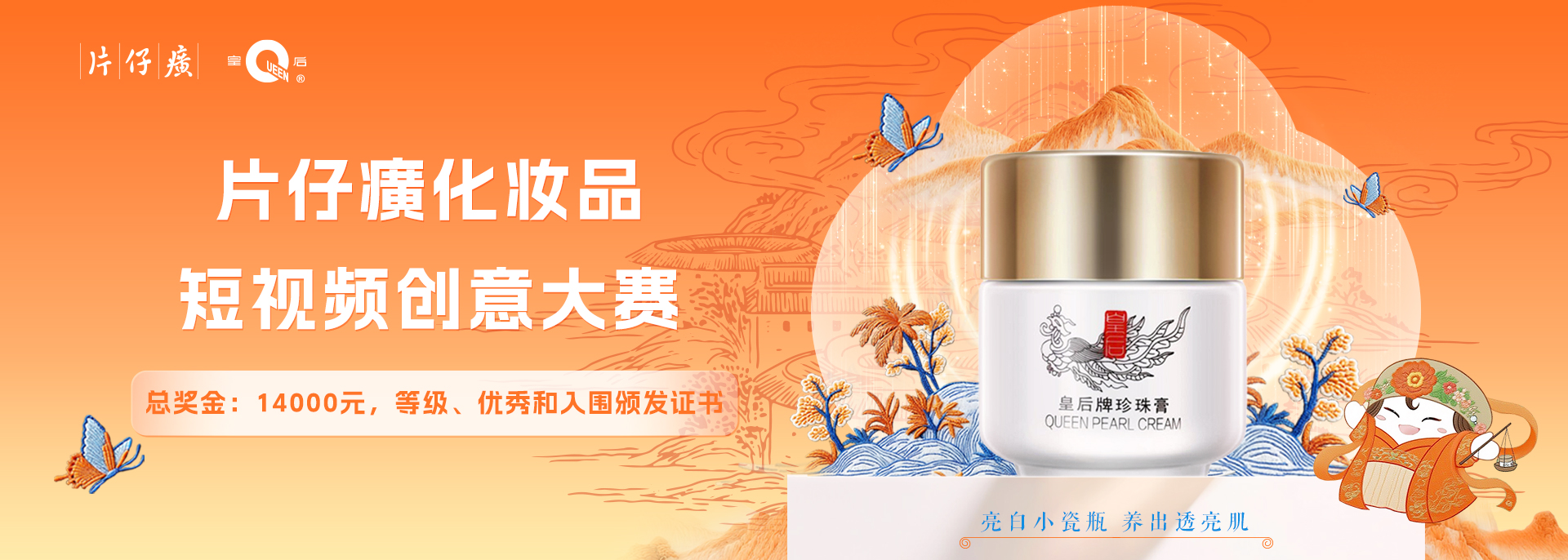 ③内容要求:围绕命题核心“国妆45 珍的藏不住”“亮白小瓷瓶 养出透亮肌”展开创作,制作情节生动、创意新颖的视频广告,能在短时间内清晰传达皇后牌珍珠膏及片仔癀化妆品的品牌价值;画面质感良好,色彩协调,音效搭配合理,无杂音,具备较高的观赏性和传播性,能与年轻人共鸣。