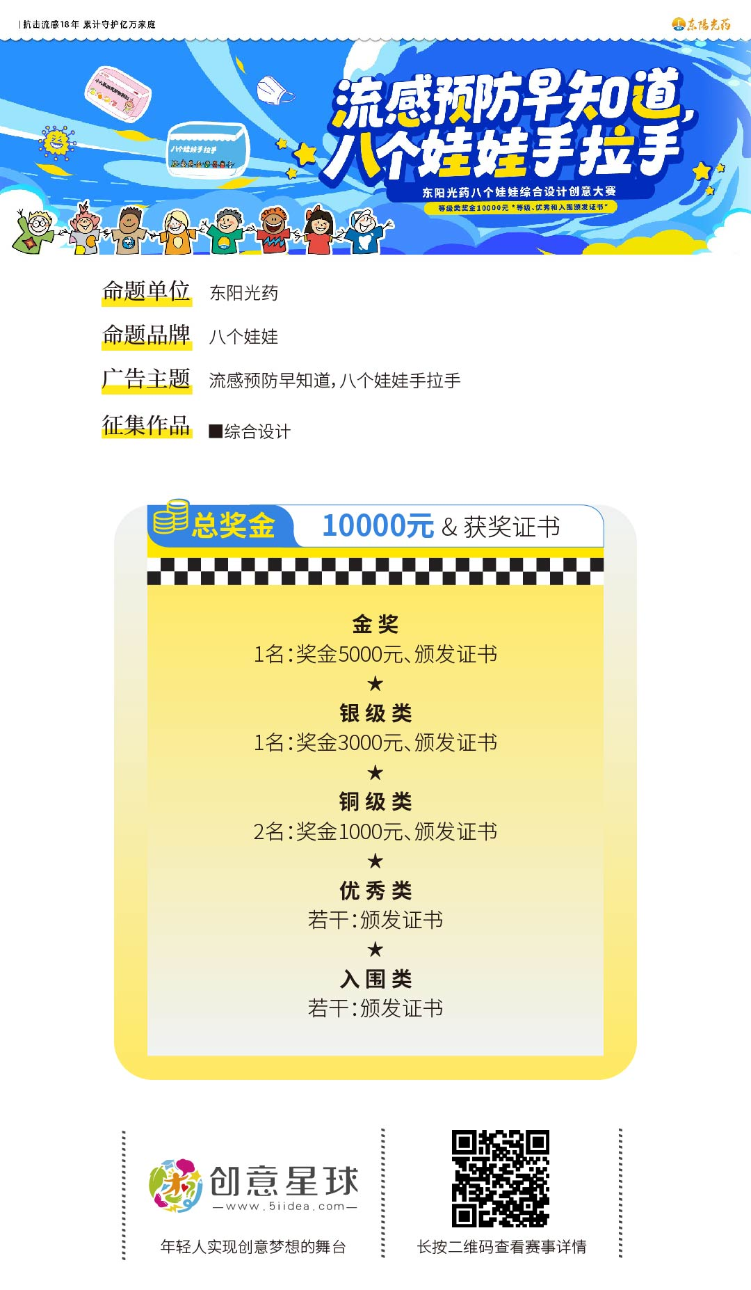 要求总述:内容创作以“流感预防”知识科普为切入点,用“八个娃娃”为主角表现广告意图,产品表达以品牌虚拟药盒为主体,产品名不可直接写具体药品通用名,可用“八个娃娃手拉手”为替换表达,并保留一定的品牌VI视觉元素如品牌标准色、白色波浪、八个娃娃、盾牌等,素材规范使用详见网盘链接。