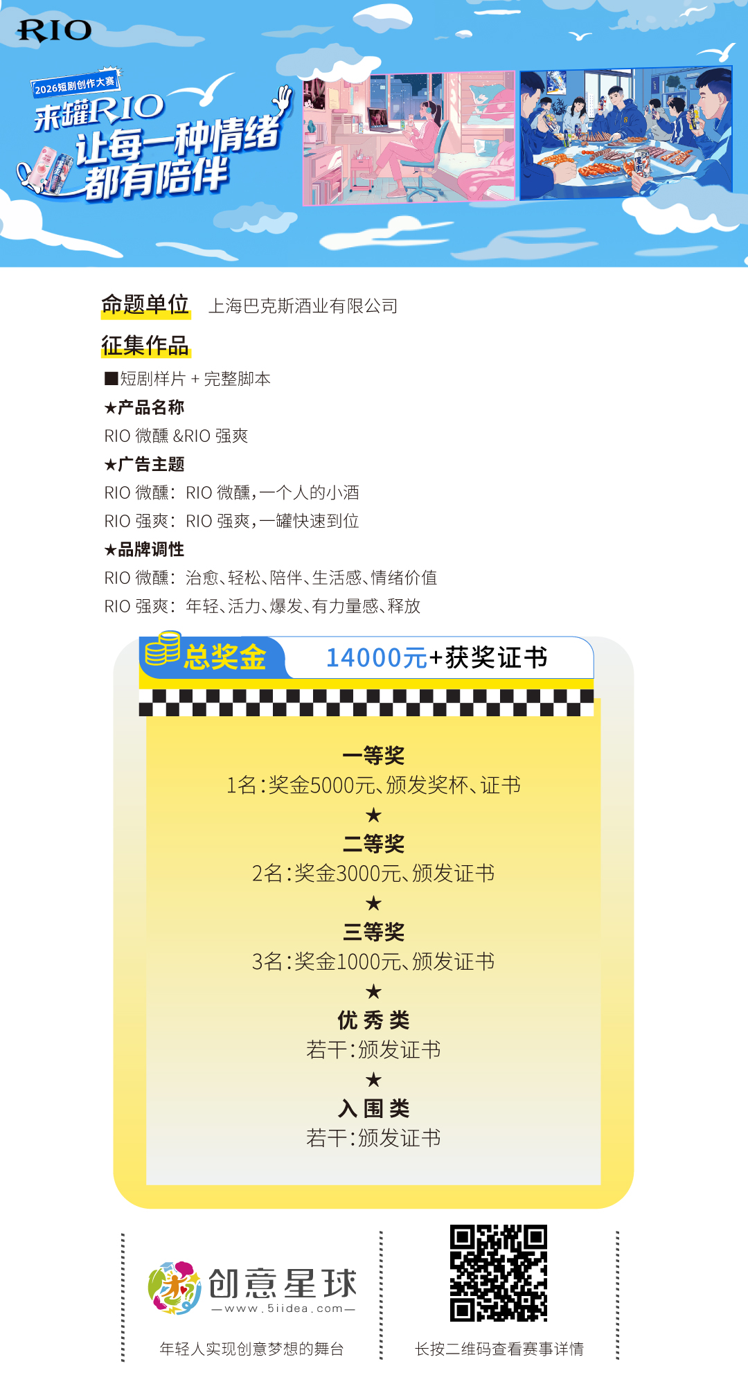 围绕RIO微醺&强爽的品牌定位及产品,面向全国高校征集具备传播潜力的短剧创意方案。