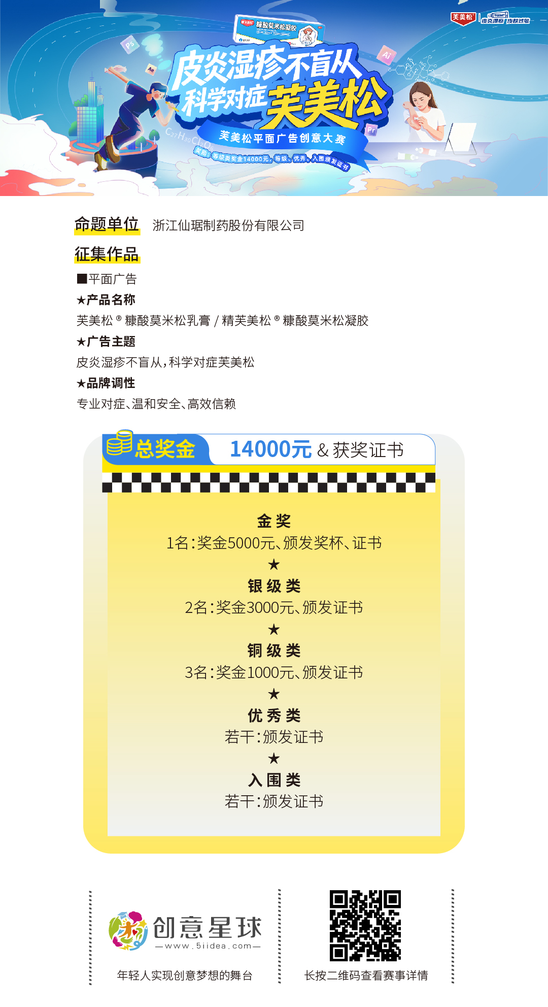 创意叙事:画面叙事性强,能快速引发“同款皮肤困扰”的共鸣。创意可将“盲目跟风偏方/拖延不治”与“科学对症芙美松”进行对比与产品转变;也可用创意画面将“软性激素、强效抗炎”等抽象概念创意化呈现;或结合大学生、户外工作者皮炎湿疹高发时刻(如考试、约会、熬夜、户外作业等)进行场景合拍,节日节点的品牌创意融合,创意角度不限,可创作产品海报、创意海报、场景海报等,更侧重作品的社交分享价值。